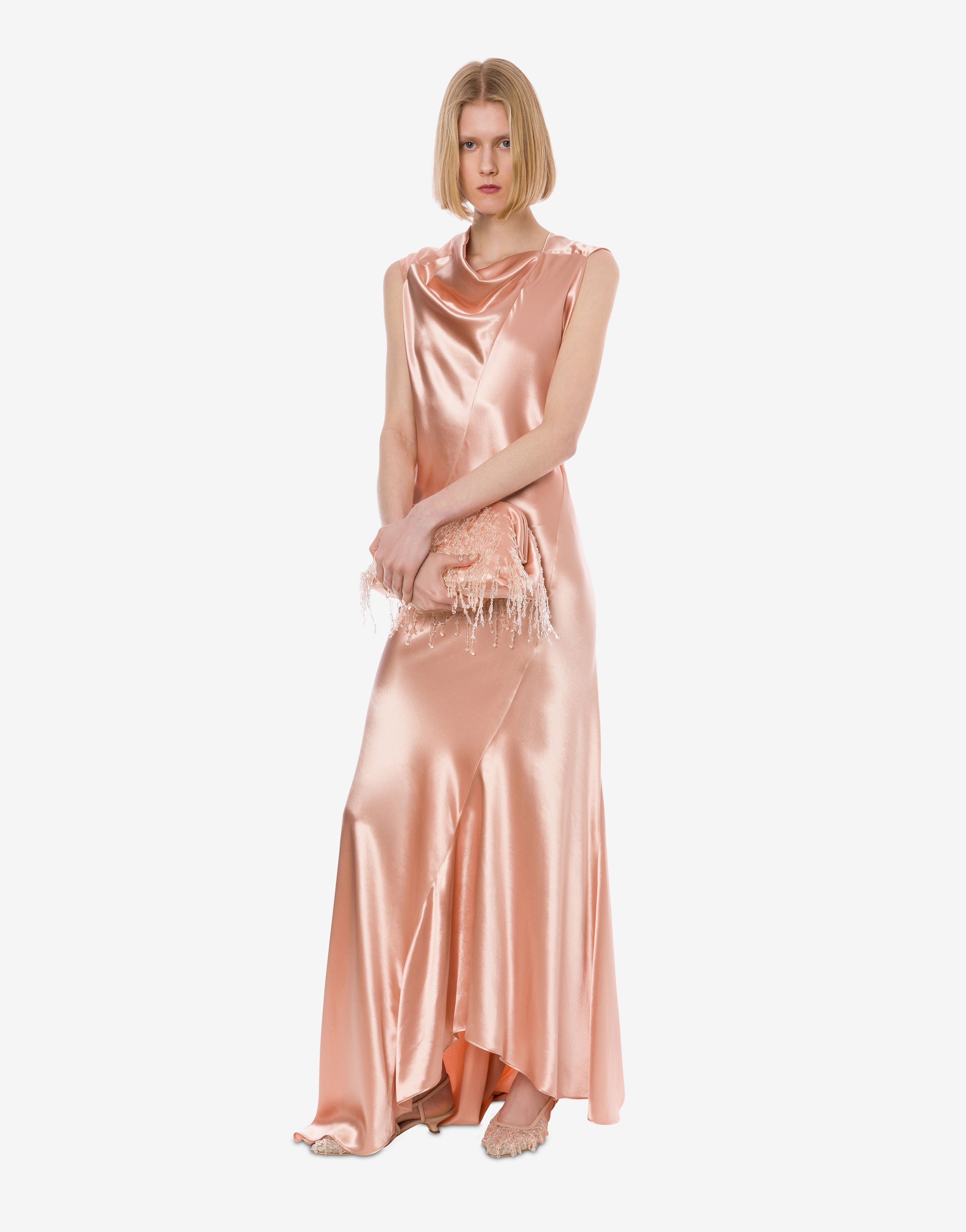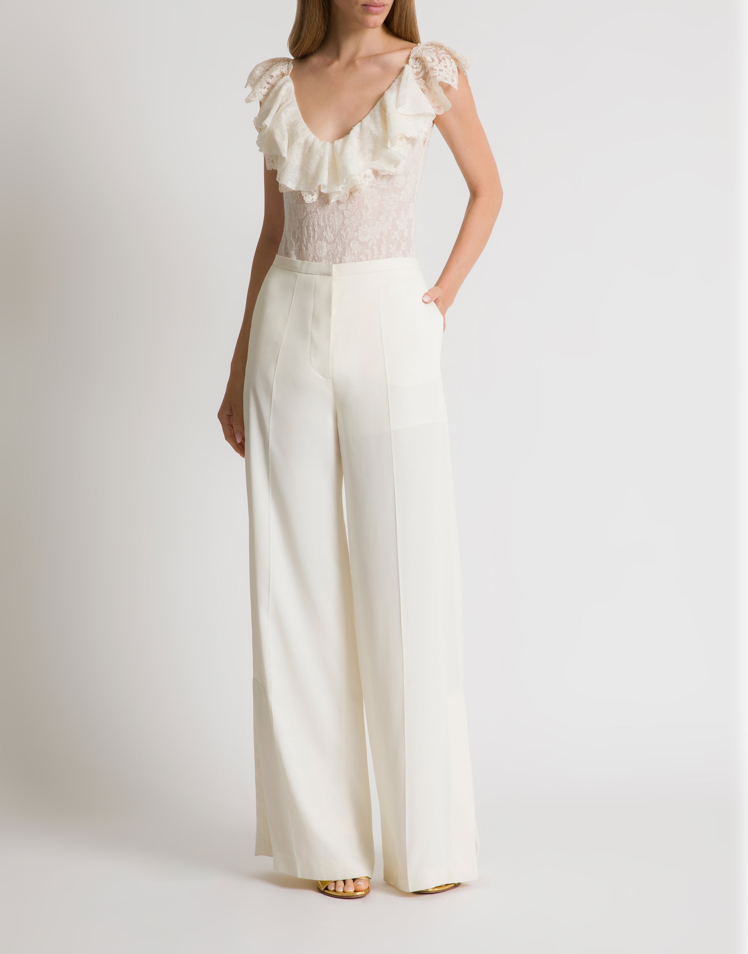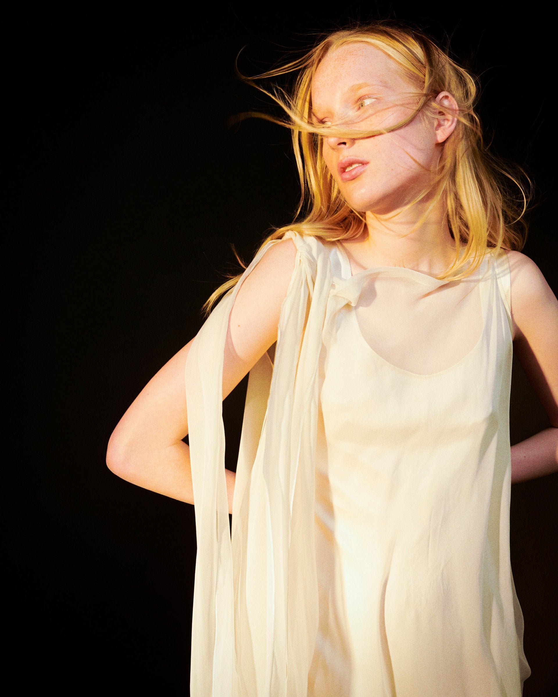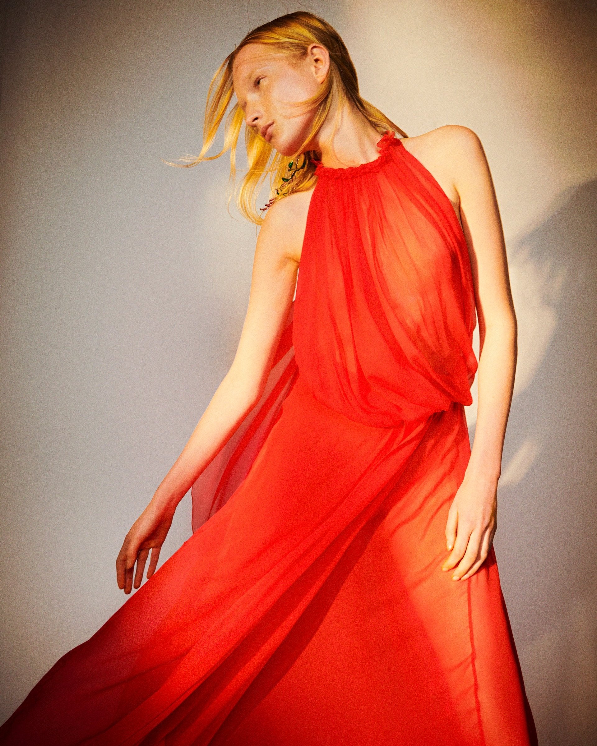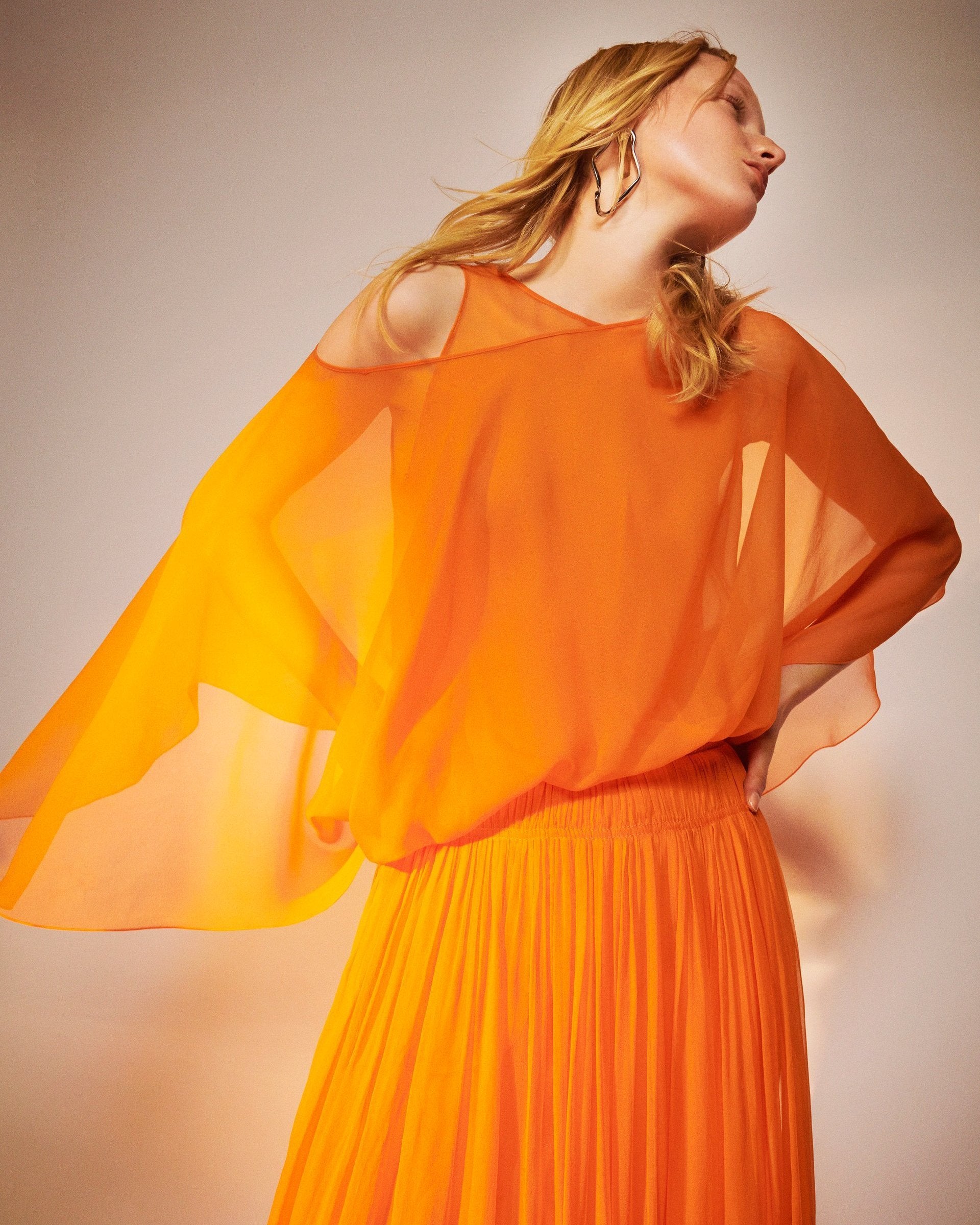 Jedwabny szyfon jest szyty ręcznie metodą dekonstrukcji, a podwójne warstwy zachowują miękkość, jednocześnie łagodząc przezroczystość. Ręcznie plisowane detale, dwustronna uniwersalność i treny dodatkowo zwiększają komfort noszenia.