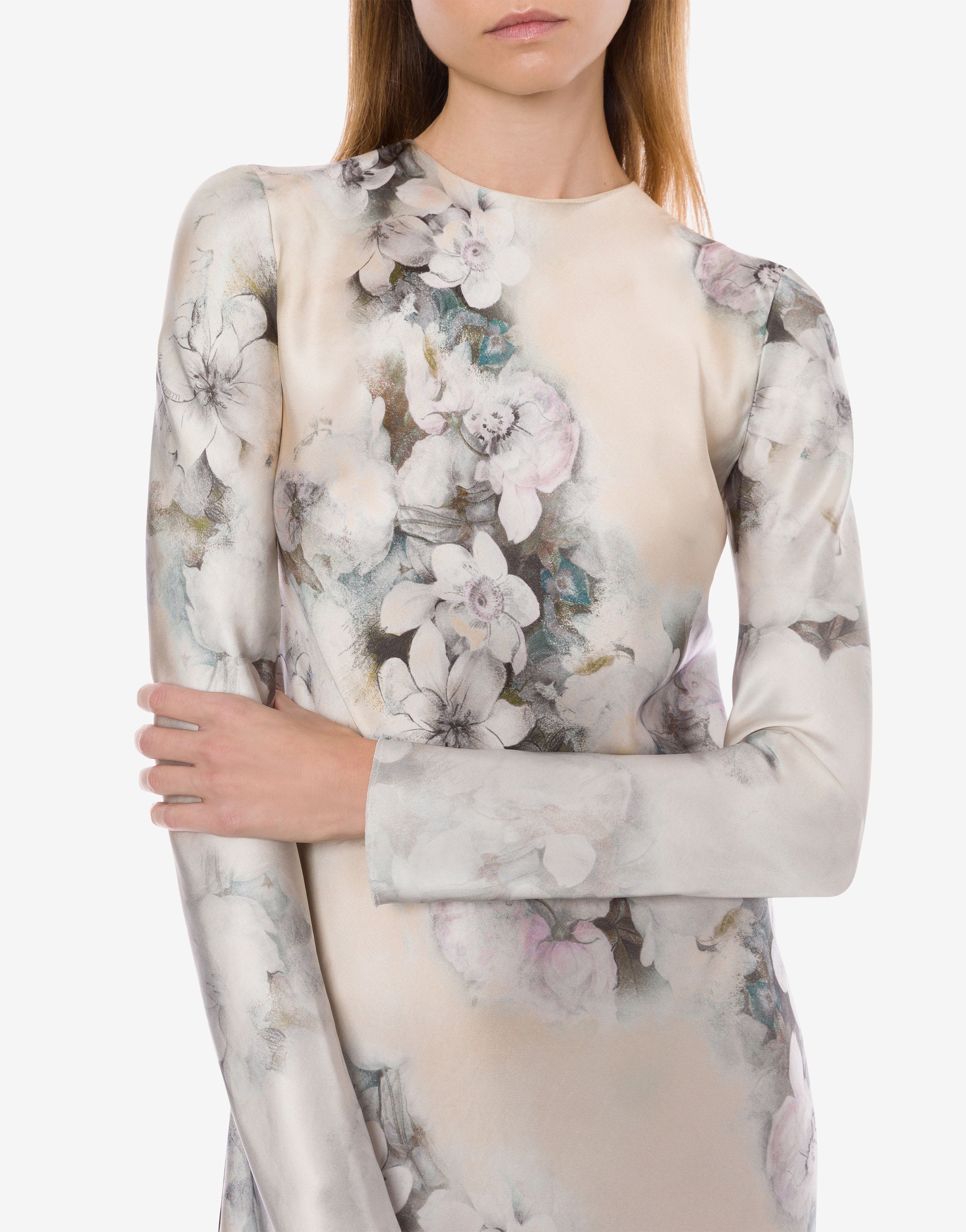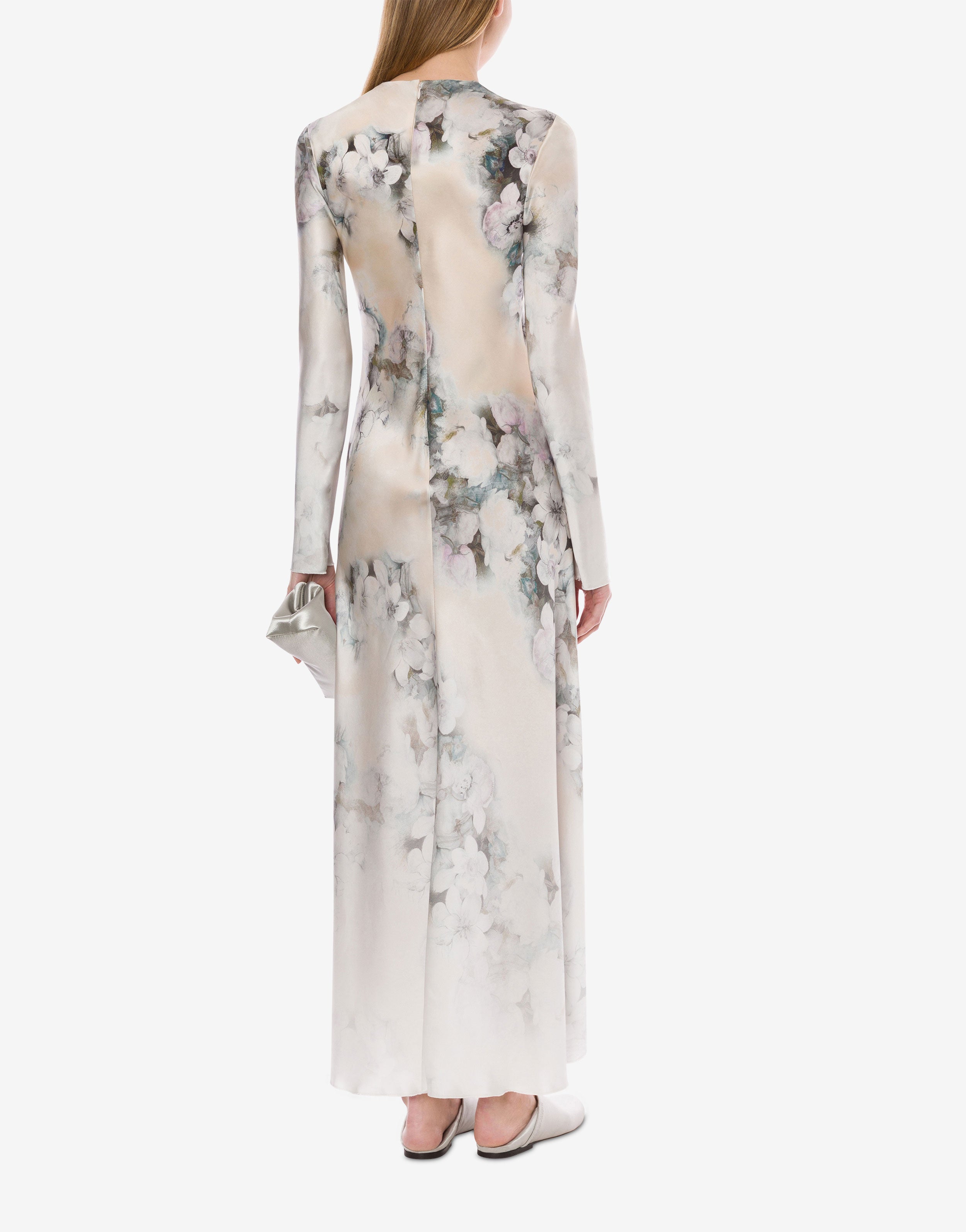 Abito lungo in raso fluido con stampa di fiori degradé. Lunghezza sopra la caviglia e maniche lunghe.