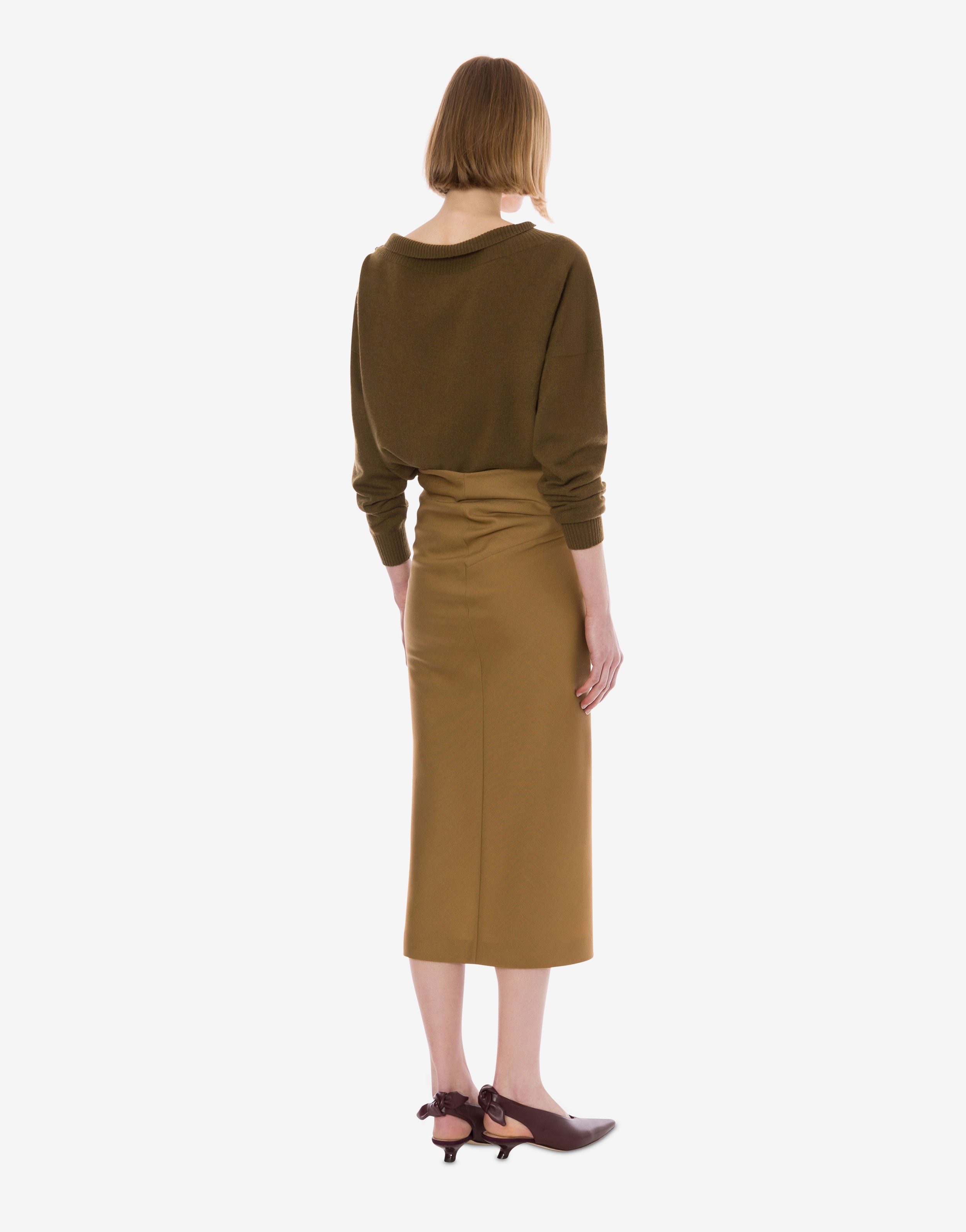 Maglione in puro cashmere con un ampio scollo a V e maniche larghe che si assottigliano in polsini aderenti. Con un dettaglio di piercing su una spalla