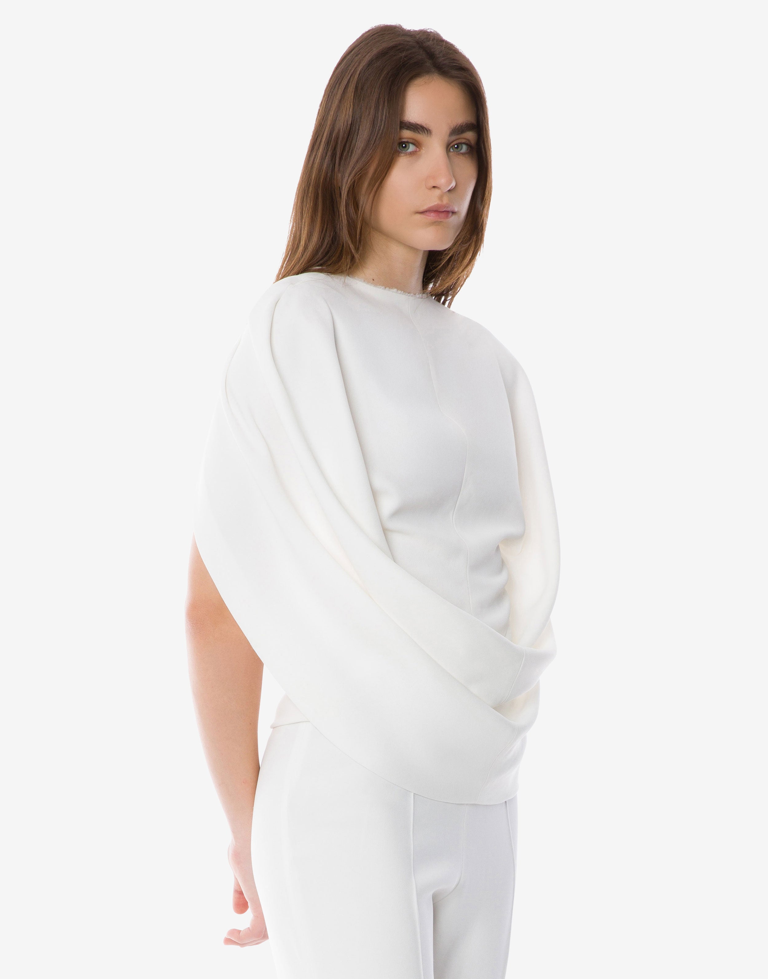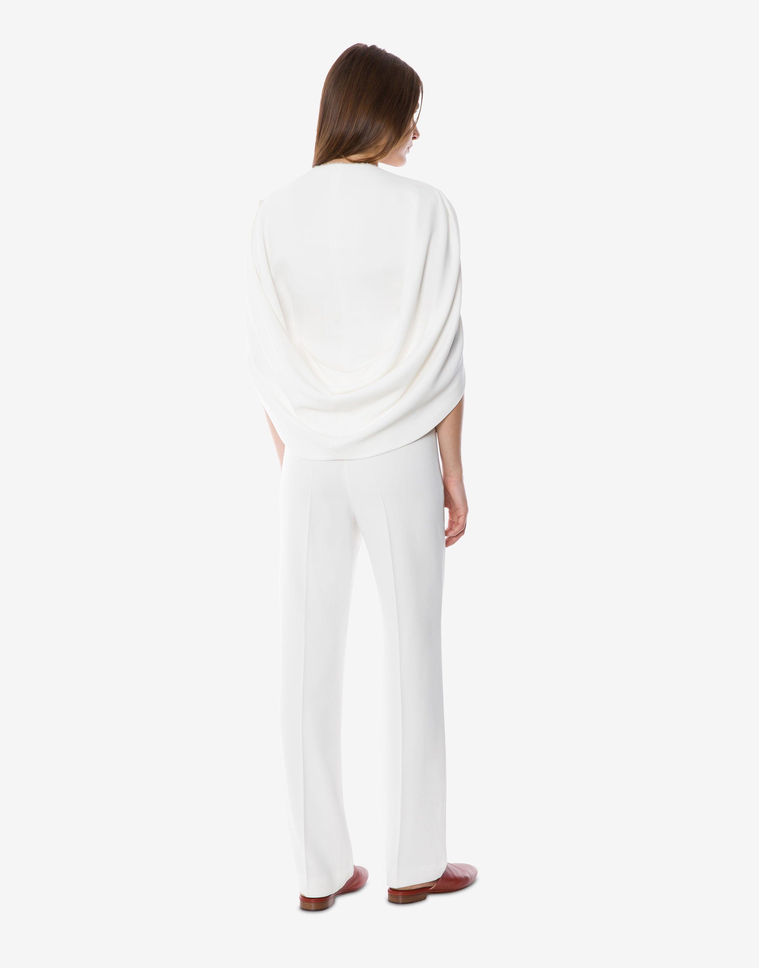 Elegante semplicità. Realizzato in tessuto cady elasticizzato, questo top a mantella con scollo a V si drappeggia sulle spalle, lasciando le maniche aperte. Top reversibile, da indossare fronte o retro, per due look diversi in un solo capo